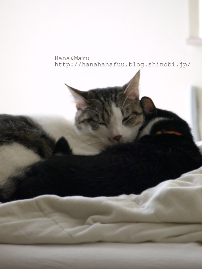 3、 ハナマルが大好き。ハナにはしょっちゅうパンチされ、寝ているとマルにまたがれたりするけど、ハナマルが大好き。でも外の猫は苦手。