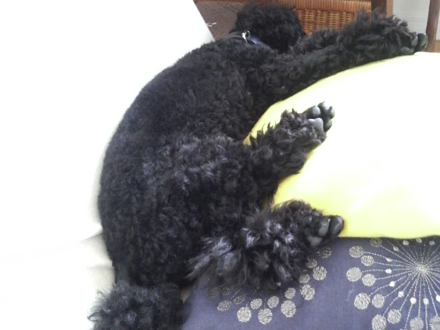 ボブの立ち入り禁止境界線に寝そべるマル。
