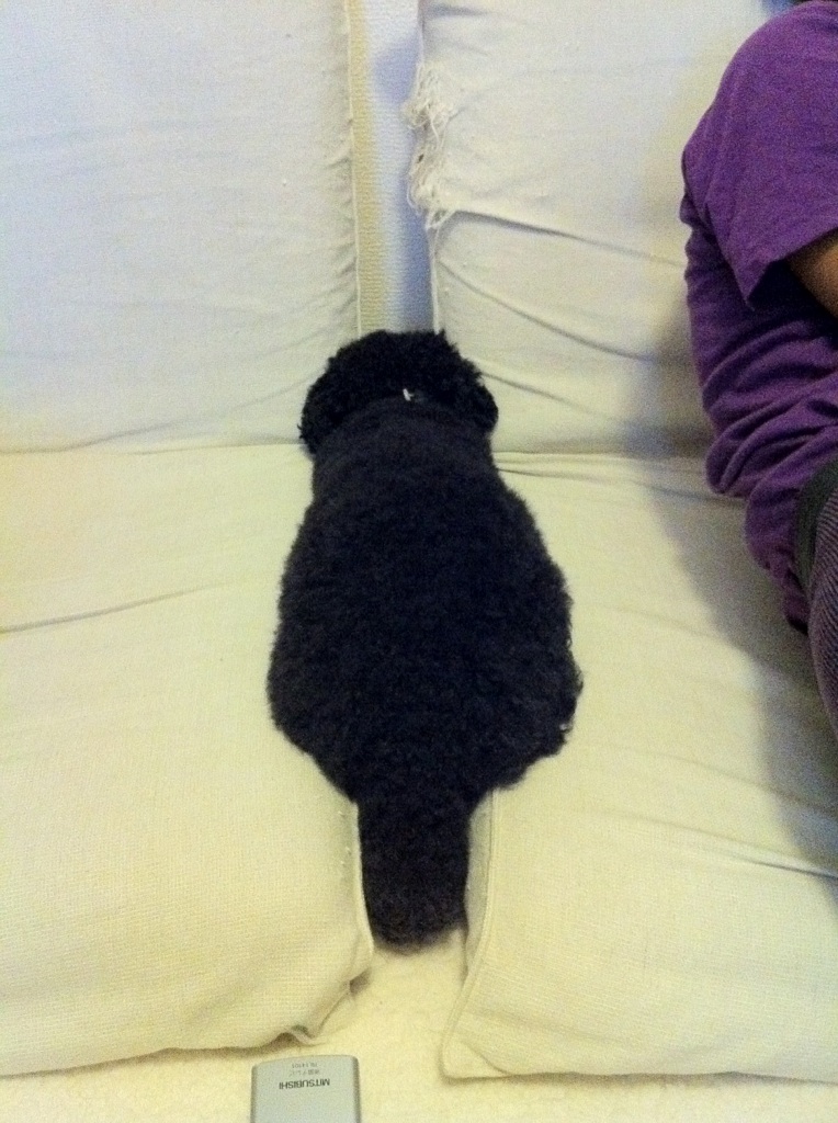 座椅子の間にはまり込むボブ。